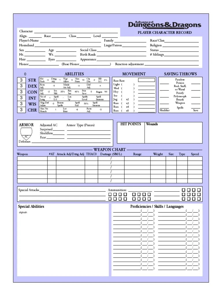 Custom 1st Edition AD&D Character Sheet Jade Gaming News