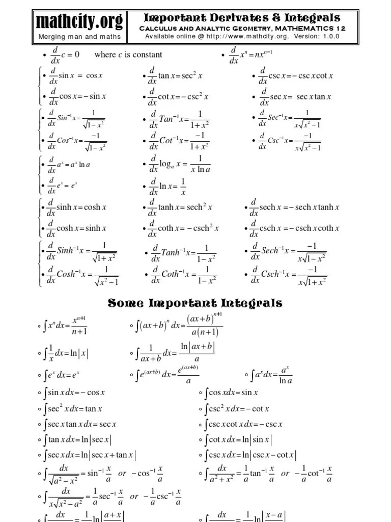 Integral Cheat Sheet Calculus derivative calc trig hyperbolic integral