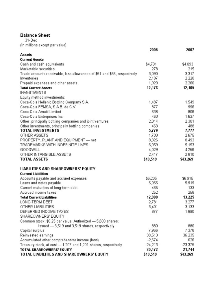 Coca Cola Co Balance Sheet Balance Sheet Stocks