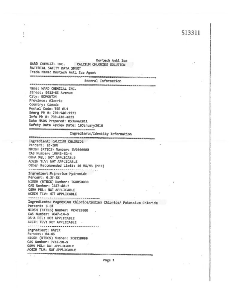 Material Safety Data Sheet on Edmonton's antiicing calcium chloride brine