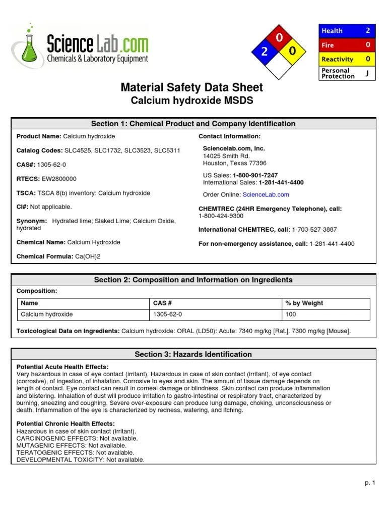 Web view or download the calcium hydroxide msds (material safety data sheet) or sds for 102047 from merck. 4.0 en replaces version of: