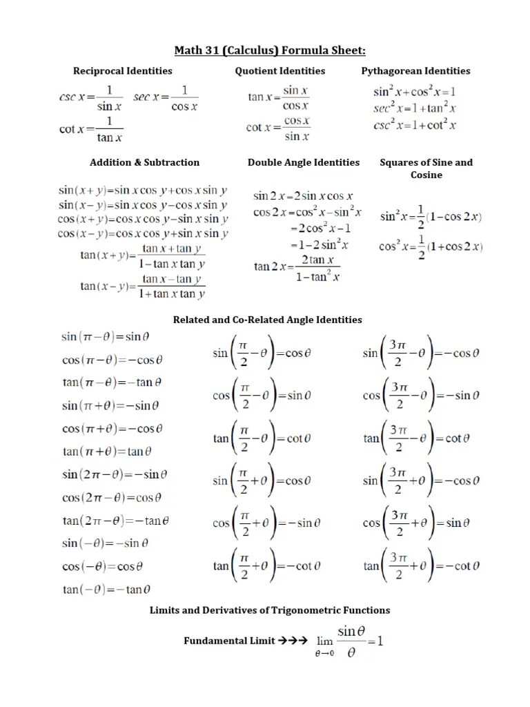 Calculus Formula Test Sheet Trigonometric Functions Function