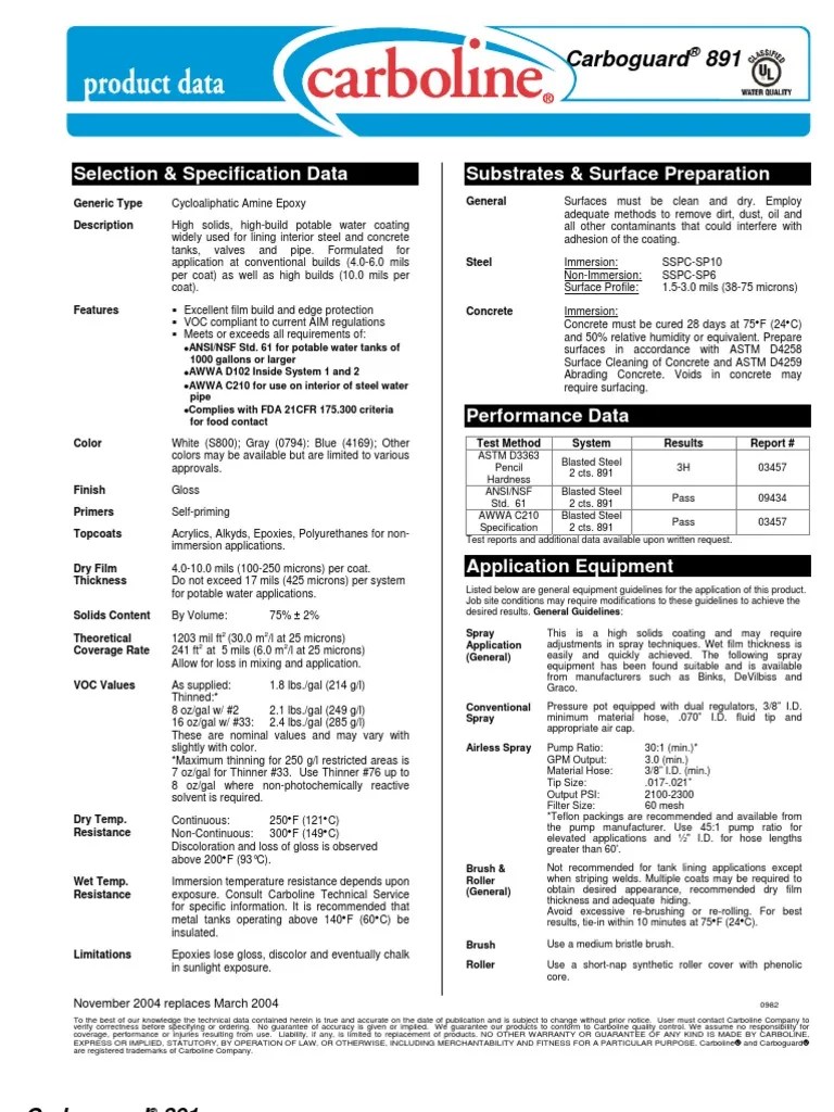 Web selection & specification data. Ultra high solids epoxy that is designed as a liner for water, demineralized water, wastewater and. Web carboguard 891 product data sheet june 2020 891 page 1 of 4 selection & specification data generic type. Web description features color finish primer dry film thickness solids content theoretical coverage rate voc values limitations.