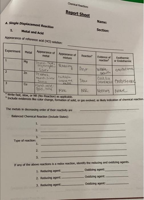 Solved Chemical Reactions Report Sheet A. Single