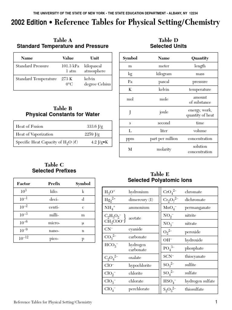 Chemistry Chemistry Reference Sheet Periodic Table Of Elements