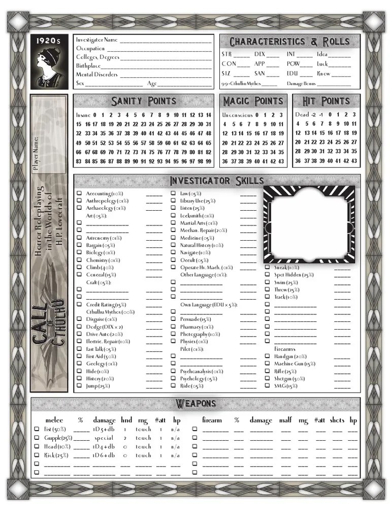 Web investigators saved to your very own 'character control panel' where you can download a pdf character sheet, choose a. Web the new sheets are currently include: October 2021 marks the 40th anniversary of call of cthulhu.