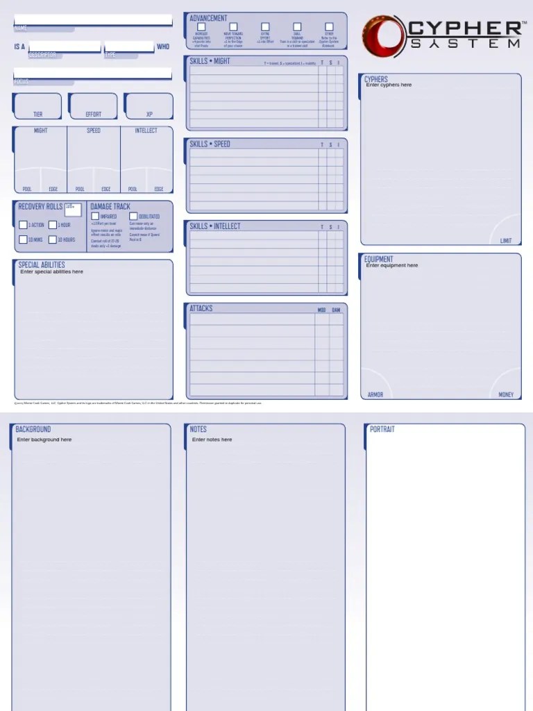 Web cypher system resources character sheets. Here are some various character sheets and online tools for cypher system, numenera, and the strange. Web the easiest would be to make it into a picture, add the picture as a layer and print it out. Web the cypher system character portfolio does the job of a standard character sheet, and so. Web.
