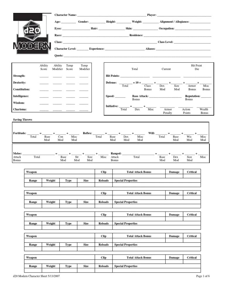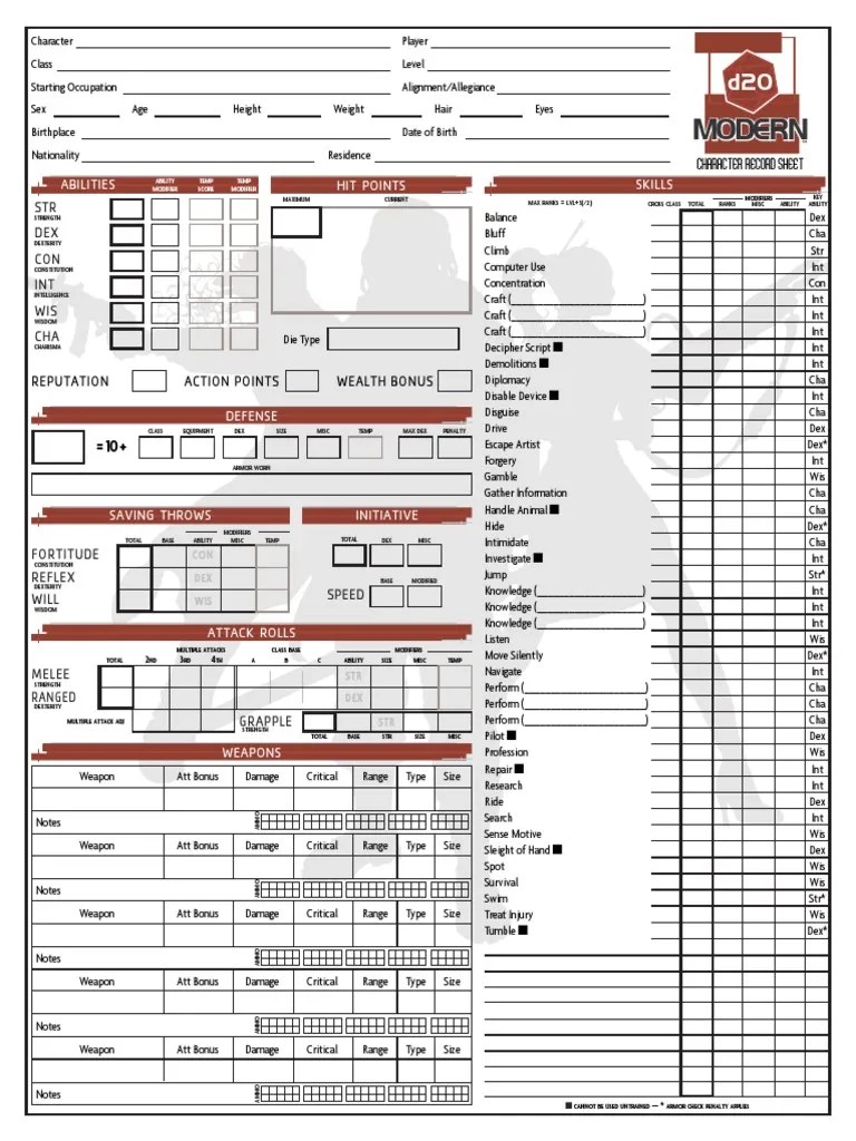 Web download various versions of d20 modern character sheets for different settings and formats. Customize the sheet with layers,.