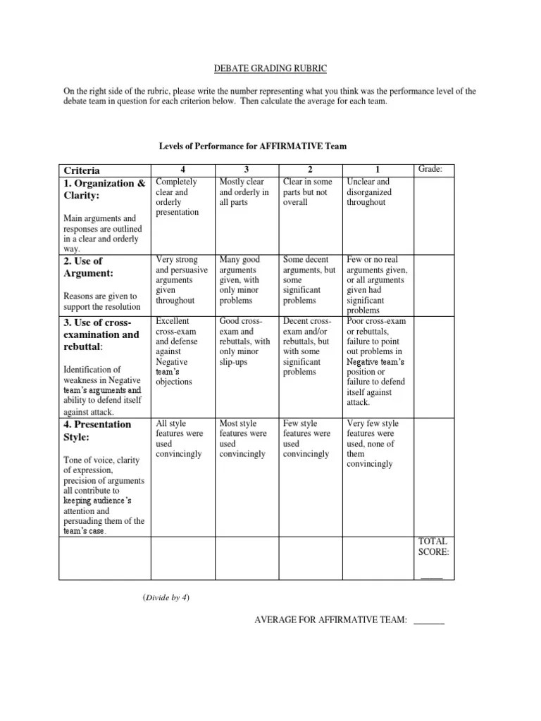 This table can be used to judge the quality and techniques other debaters are using to convey their points. Scoring sheet for rubric for evaluating debate performance Use this rubric to rate each group in every category on a scale of 1 to 4. Web you've reached the end of another grading period, and what could be more daunting than.