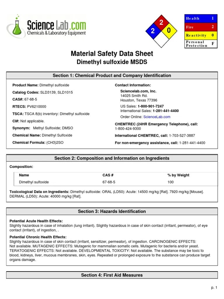 Dmso Safety Sheet - Dmso 5 to 10 % section 2) hazards identification. Identification fisher scientific company one reagent. Web safety data sheet section 1)identification product id: