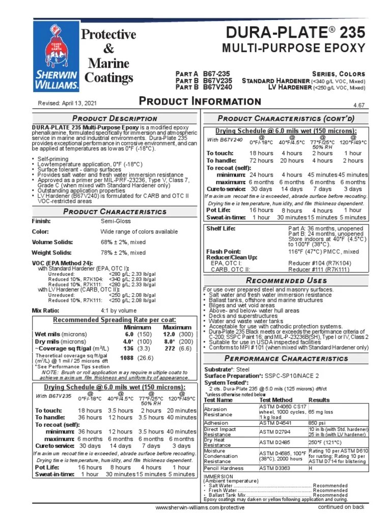 Duraplate 235 Data Sheet - Formulated specifically for immersion and atmospheric service in marine and industrial. Provides salt water and fresh water immersion. Formulated specifically for immersion and atmospheric service in marine and industrial environments, dura.