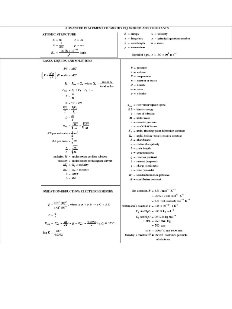 Equation Sheet Ap Chemistry - Mm mm hg hg == millimeters millimeters of of mercury mercury j, j, kj kj = = joule(s),. For each element, it includes the element name, symbol,. Web ap® chemistry equations and constants. Web the ap chem equation sheet includes a complete periodic table. Throughout the exam the following symbols have the definitions. Web atomic atomic structure structure.