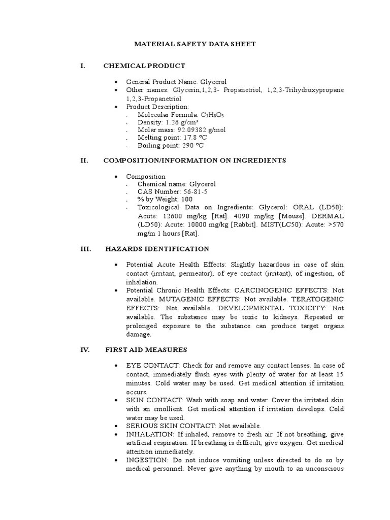 Material Safety Data Sheet I. Chemical Product PDF Fires Glycerol