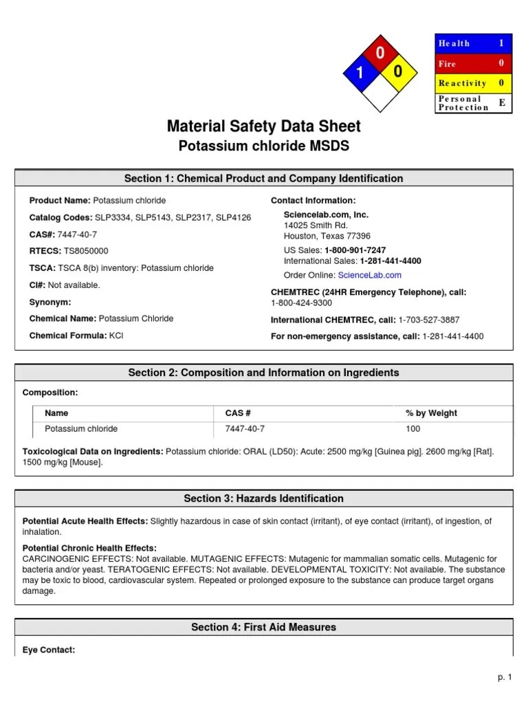 Msds Potassium Chloride 0.1M Toxicity Water Free 30day Trial