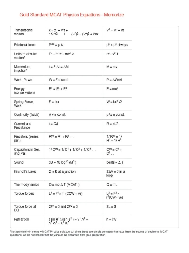 Web gold standard's mcat physics equations sheet ('cheat sheet' notes, formulas) this mcat physics equations sheet provides helpful physics equations for exam preparation. D = distance, t = time. Web resistors in series: Mcat equations sheet a complete worksheet with all the equations you need to know for the chem/phys. ∆x = displacement, ∆t = elapsed time.
