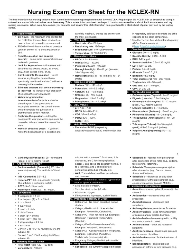 Nclex Cheat Sheet - Web nclex cram sheet by mometrix. Basic metabolic panel (bmp) sodium (na):