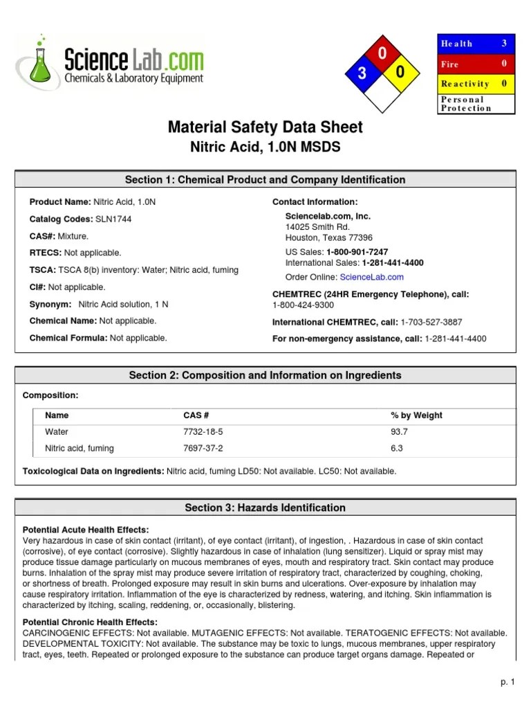 (PDF) p Material Safety Data Sheet Nitric acid, 70 MSDS Section 1