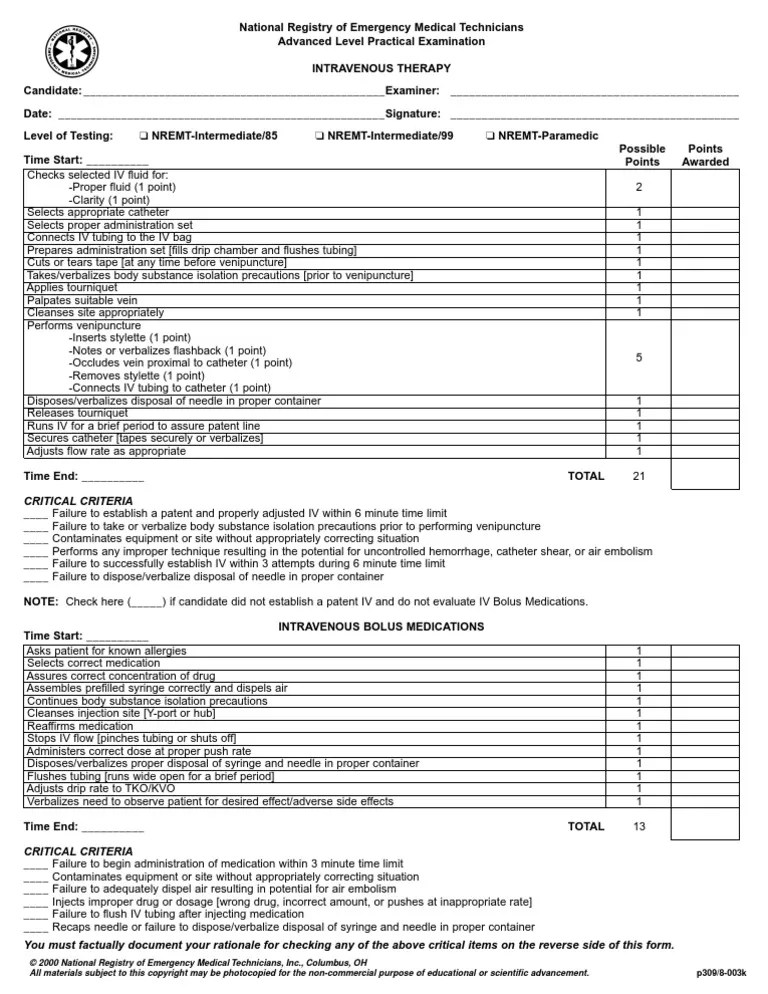 Nremt Iv Skill Sheet - Several patient scenarios are provided for you to read to the candidates. Web intravenous bolus medications skill examiner key points an array of medications in prefilled syringes should be presented to the candidate to allow the candidate to choose the appropriate medication. 2021 national registry of emts page 5 of 6. Web you must factually document your rationale for checking any of the above critical items on the reverse side of this form. 2020 national registry of emergency medical technicians, inc., columbus, oh all. Web iv, io and medication instructions to skill examiners. Web intravenous therapy in this skill, you will evaluate the candidate's ability to establish a peripheral iv on a manikin arm. Read the following instructions to all advanced emt candidates: Instructions to the advanced emt psychomotor skills.