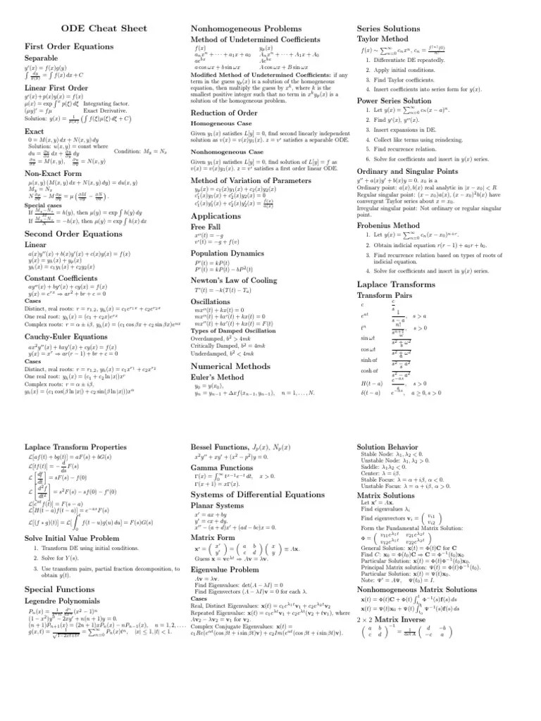 ODE Cheat Sheet Ordinary Differential Equation Equations