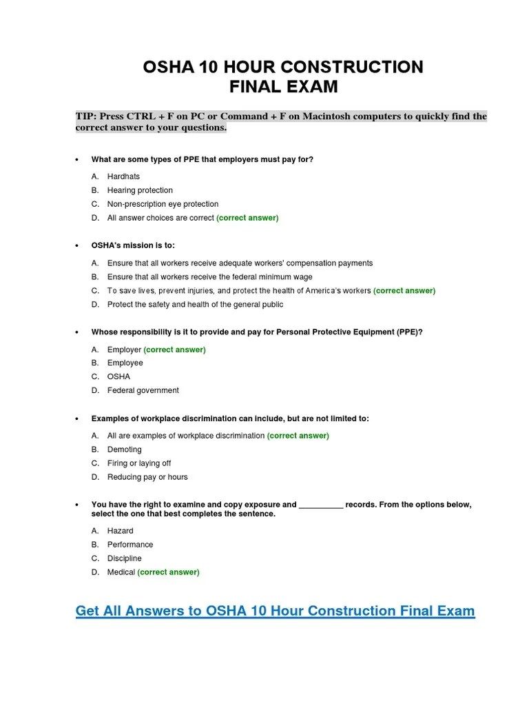 OSHA 10 Hour Construction Final Test Answer Key Care_Sa
