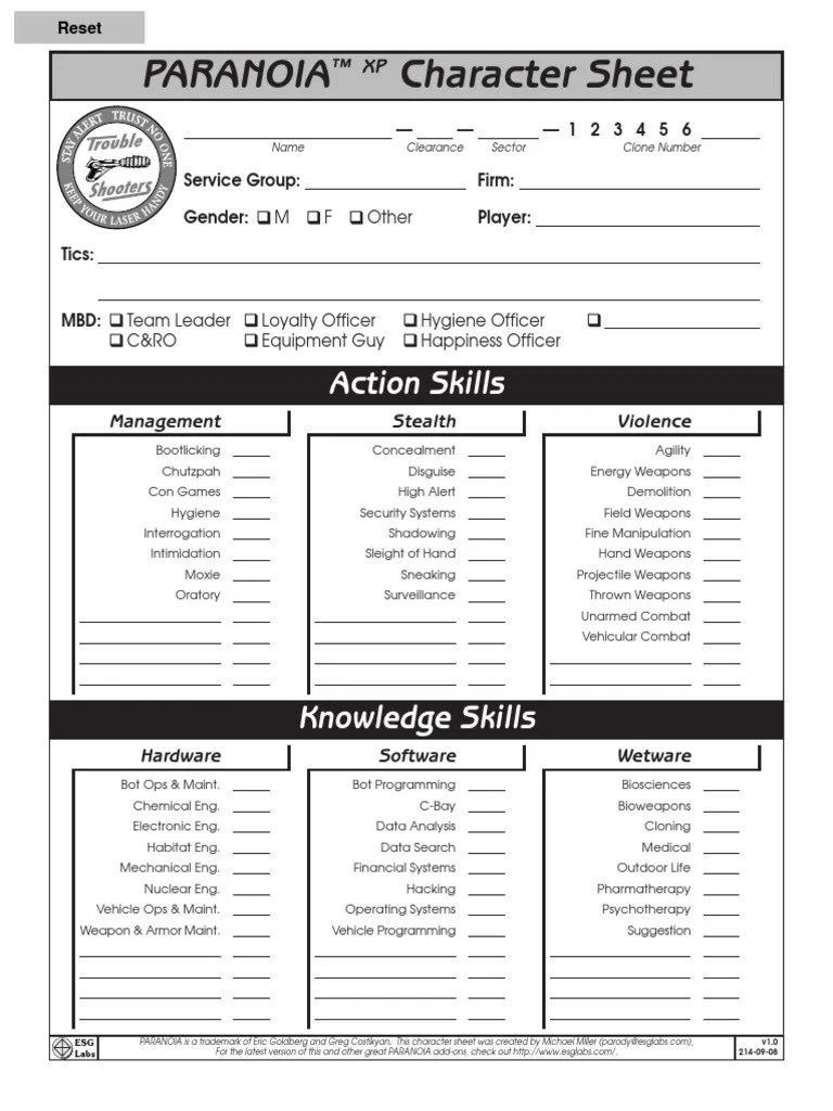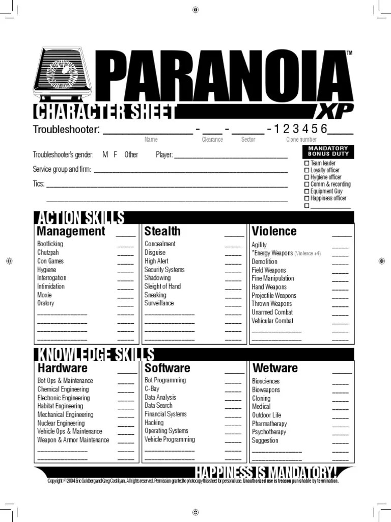Paranoia Character Sheet - Web paranoia shield maidens traveller core rulebook update 2022 title notes download link faq & errata tweaks and changes to core rulebook update 2022 download (2. Unauthorized use will result in immediate termination! There are 3 official character sheets for this game in total, and all of them suffer from multiple usability issues, both on. Web character sheet, or character sheets? Web updated form fillable paranoia perfect edition character sheet. These character sheets are acrobat forms, so you can type into them before printing them out. Web paranoia character generator paranoia xp character generator clearance ultraviolet only!