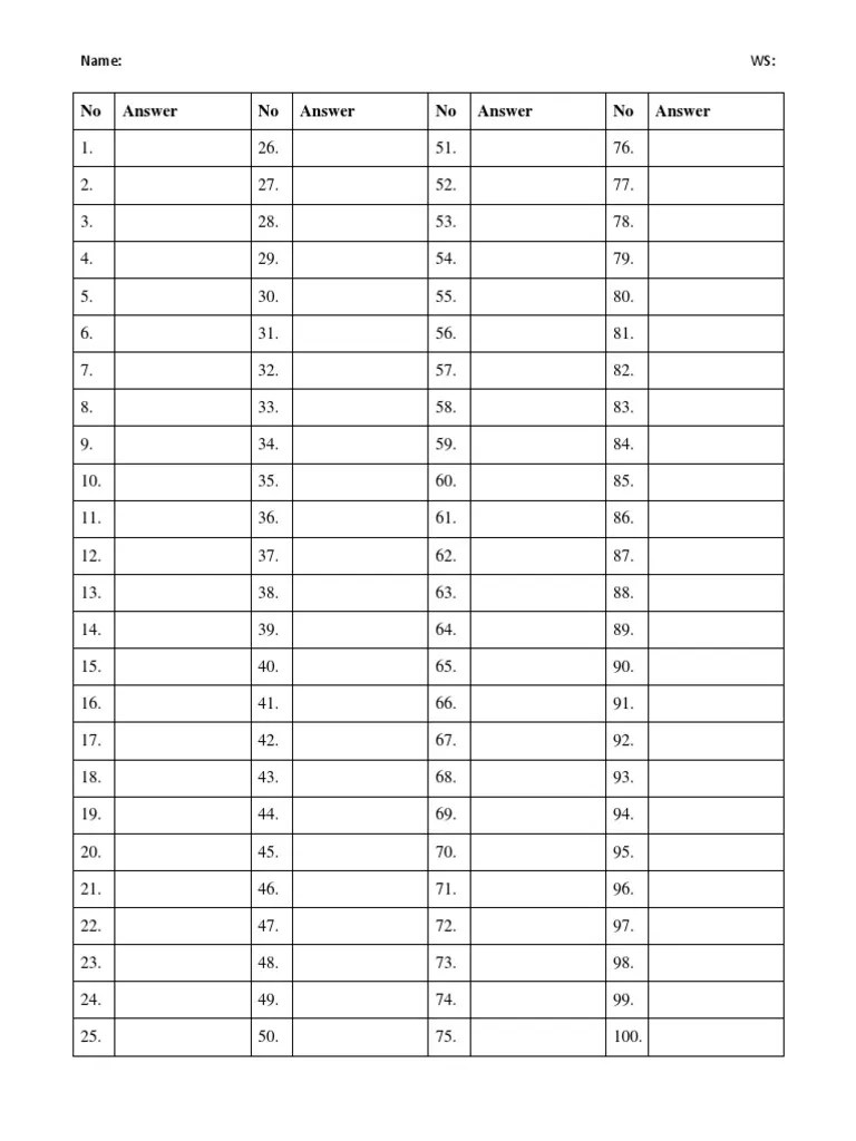 Answer Sheet Answer Sheet 100 questions, Word template, English