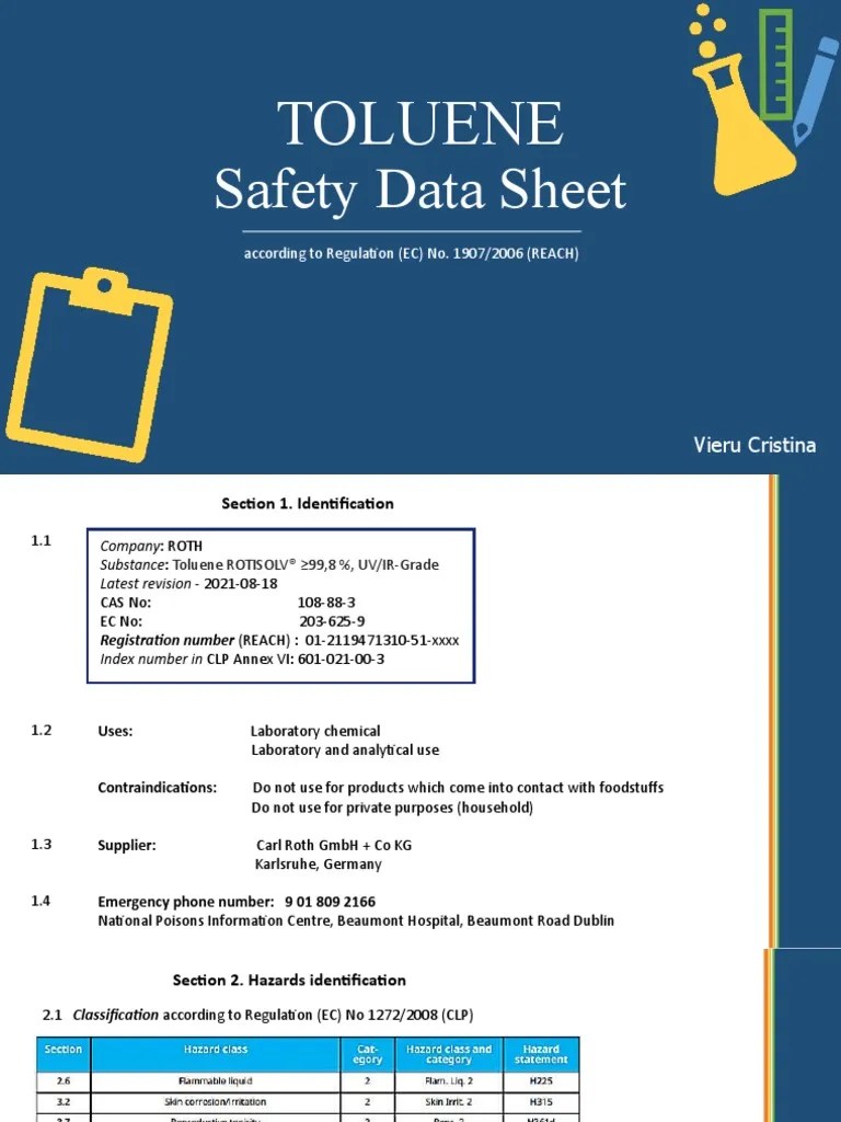 Identification of the substance/mixture and of the company/undertaking product. Identification product identifier toluene 99.8% chemical name: Web highly flammable liquid and vapour may be harmful if swallowed and enters airways causes skin irritation may cause drowsiness or dizziness suspected of damaging fertility or the unborn child may cause damage to. 30255020/sds_gen_00/en) date of print 05.01.2024 1.
