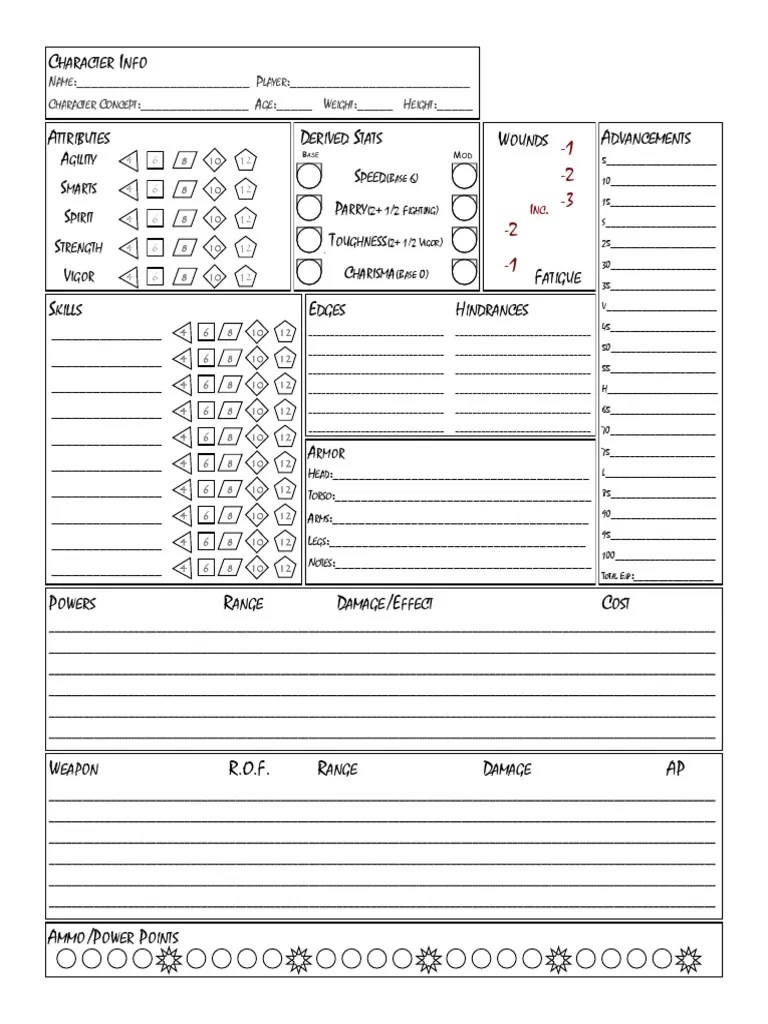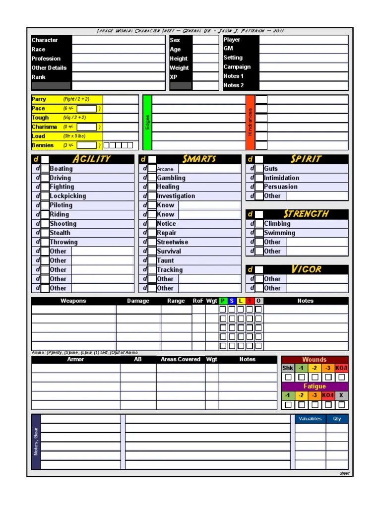 Web this free download gives you a set of two character sheets to print and use with our savage. This is a page for how to use the official savage worlds sheet. Web just follow these steps: If there's something you want added, or you'd like to report a. Web savage worlds character sheet links.
