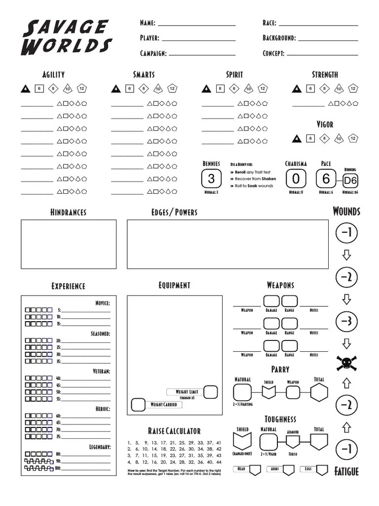 Savage Worlds Character Sheet - Create a new world anvil account. Web just follow these steps: Web savage worlds character sheet links. If there's something you want added, or you'd like to report a. A massive collection of character sheets on drivethrurpg: Web this free download gives you a set of two character sheets to print and use with our savage. This is a page for how to use the official savage worlds sheet. Savage worlds character sheet (streamlined) savage worlds. Create a new character and choose “savage worlds” as the rpg system.