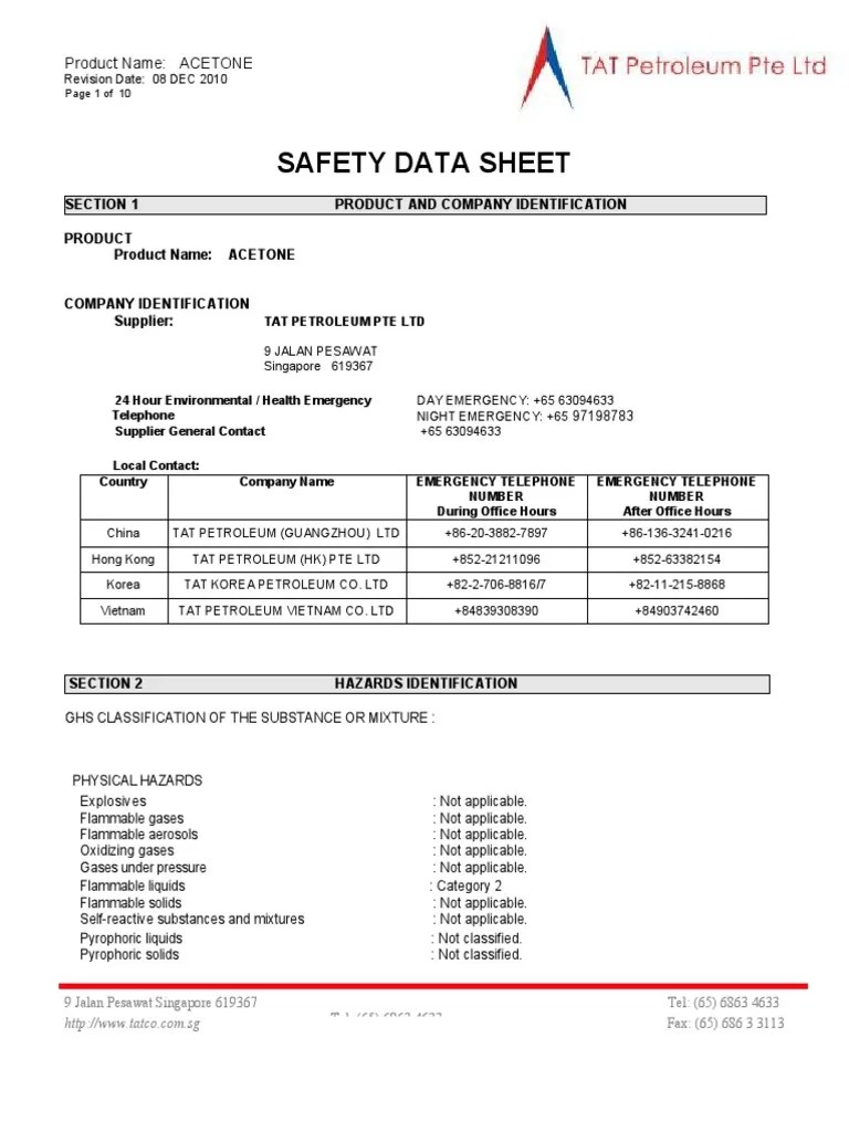 Msds Acetone Dangerous Goods Personal Protective Equipment