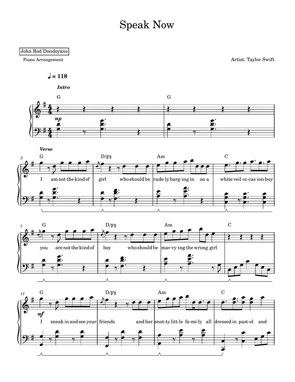 Taylor Swift Speak Now (PIANO SHEET) Notenblatt by John Rod Dondoyano