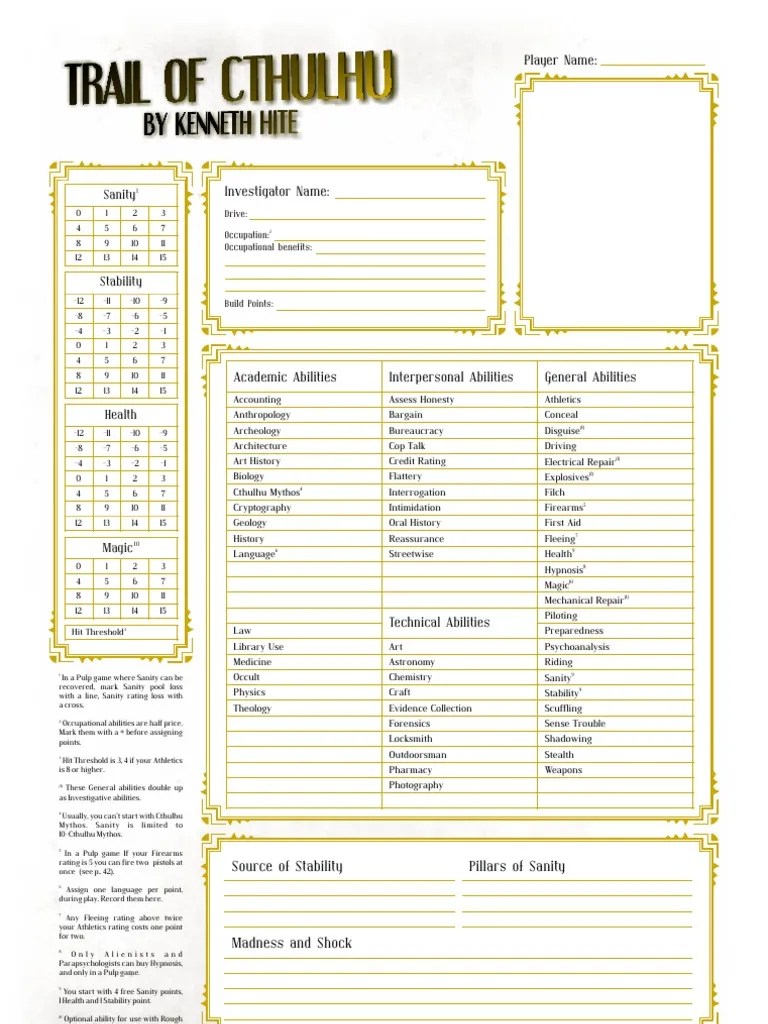 Trail Of Cthulhu Character Sheet - Web download a character sheet that includes the magic ability from rough magicks. 5 in a pulp game if your firearms rating is 5 you can fire two. Web download the character sheet and other forms as a small pdf. Download the cthulhu apocalypse character sheet.