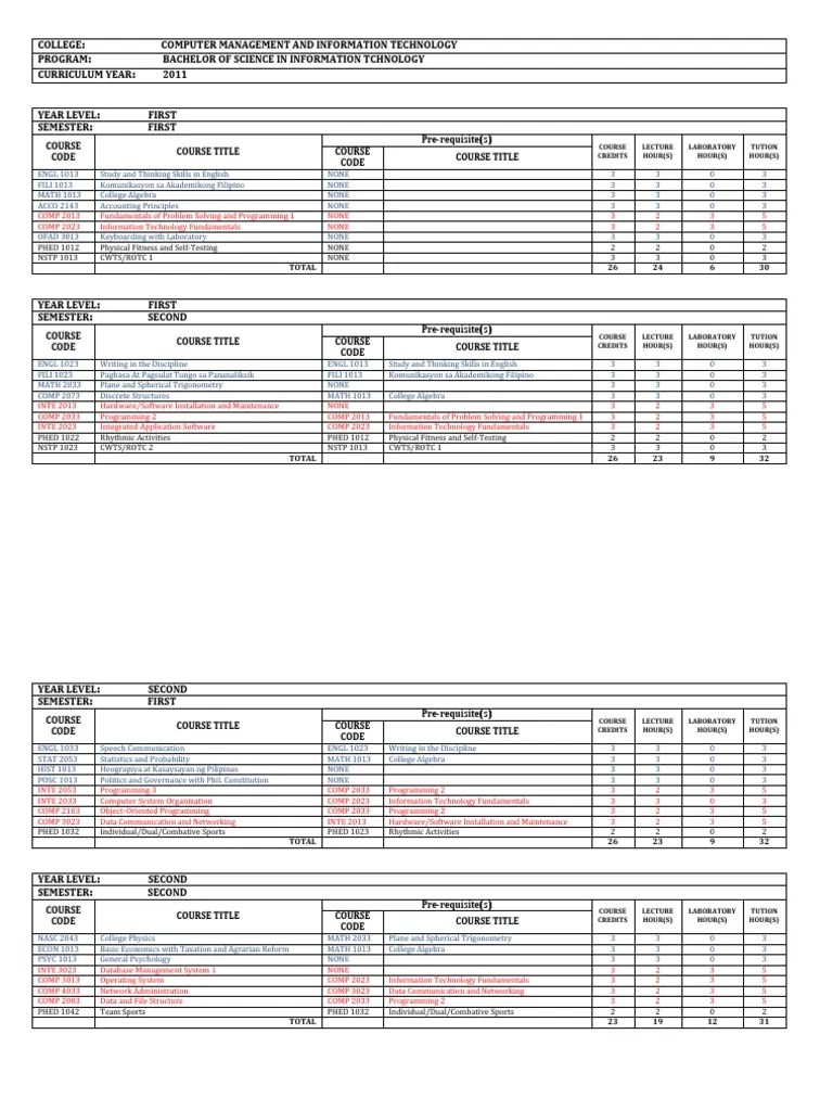 PUP BSIT Curriculum sheet 2011 Computer Programming Course Credit