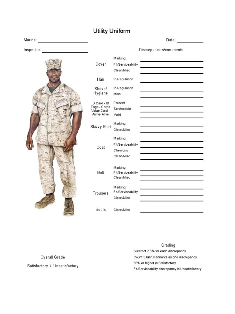 Each each area is graded for servicability, proper marking, and proper fitting. To establish policy for the implementation and conduct of the quarterly commander’s gniform. Drivers physical form (med cert) 414.32 kb. Cl) enlisted uniform inspection sheet (2) officer uniform inspection sheet 1. Mco 1020.34h 01 may 2018 4.