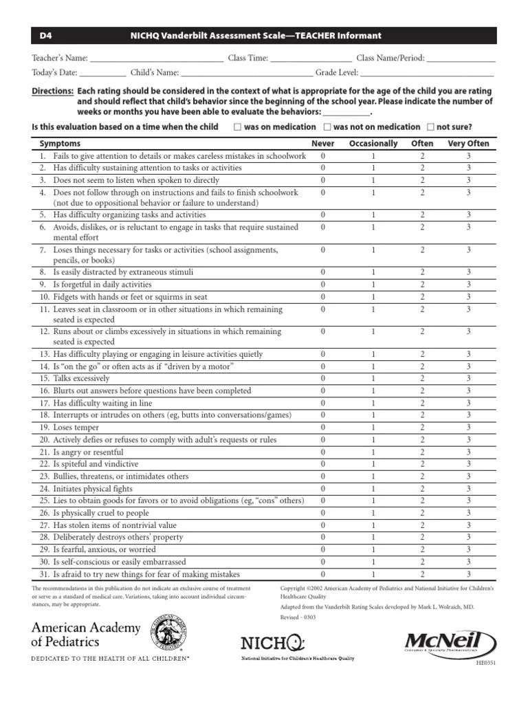 Vanderbilt Rating Scale Scoring Instructions Attention Deficit