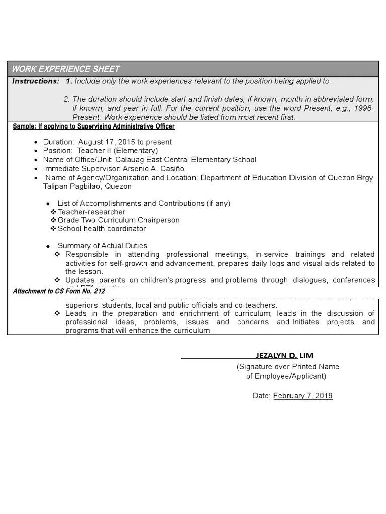 CS Form No. 212 Attachment Work Experience Sheet PDF Education